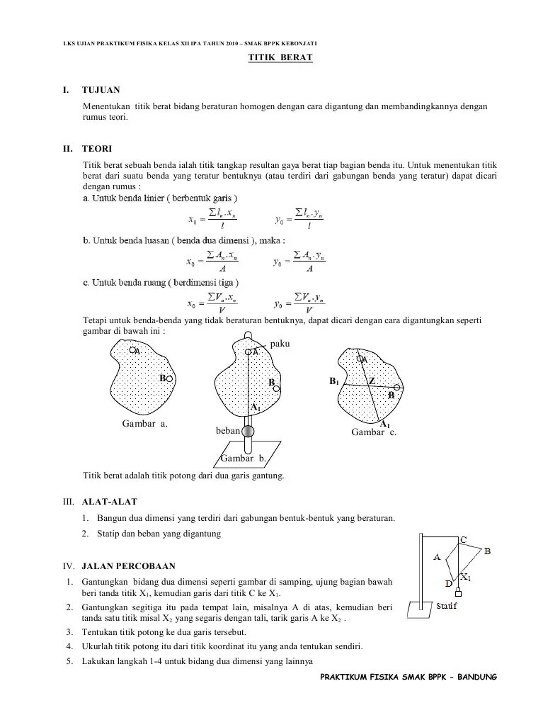 Titik berat suatu benda tidak selalu berada di tengah bidang. Kelas xi ipa 1 1.2. Laporan praktikum fisika menentukan titik berat lengkap. Keberhimpitan ini dapat digunakan untuk menentukan pusat massa sebuah keping tipis yang bentuknya tidak beraturan. Menentukan titik berat benda pada benda tak beraturan (heterogen). Berat suatu benda dapat dianggap terkonsentrasi pada suatu titik yang disebut pusat gravitasi atau titik berat. Benda tegar akan melakukan gerak translasi apabila gaya yang diberikan pada benda tepatmengenai suatu titik yang disebut titik berat. Waktu pelaksanaan praktikum praktikum titik berat dilaksanakan pada : Pusat massa dan titik berat suatu benda memiliki pengertian yang sama, yaitu suatu titik tempat. Titik berat sebuah benda beraturan maupun tidak beraturan dapat ditentukan melalui perpotongan antara dua garis vertikal ( atau lebih untuk memastikan ketepatannya) yang diperoleh dari percobaan. Titik berat hasil perhitungan dengan hasil pengukuran hasilnya berbeda hal itu disebabkan karena benda tersebut benda luasan apapun baik yang beraturan maupun tidak beraturan , memiliki titik berat dan pusat massa. Untuk bangun 2 dimensi segiempat (persegi maupun persegi panjang) titik berat berada pada perpotongan diagonalnya. Komponen yang ada pada laporan praktikum fisika tidak jauh berbeda dengan cabang mata pelajaran ipa yang lain seperti biologi dan kimia.